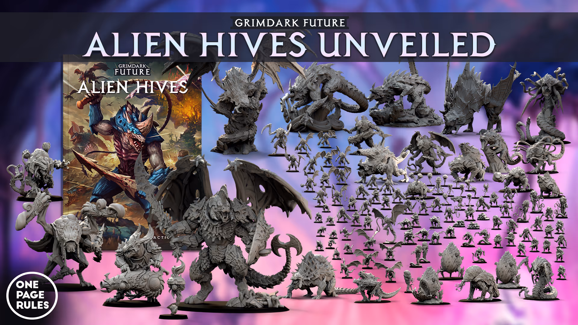 Celebrating the release of our next Grimdark Future Faction Book release, this time for the Alien Hives! Faction books are expansive supplements that cover the lore and history of a specific faction in the OPR universe. Teeming with gorgeous art and covering every aspect of the life, worlds, and forces of the Alien Hives.