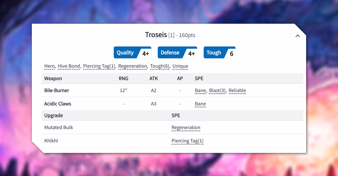 As the primary object of Troseis's focus, The Bile-Burner is the main way he likes to commit in battle. With 2 Attacks and Blast (3) he can douse a lot of infantry in acidic bile. Reliable makes sure that those initial hits actually hit to spread out the blast, and Bane makes sure that Regeneration wont be an issue and any lucky 6's turn into an enemies downfall instead. Khīkhī supports Troseis by adding Piercing Tag which will give some AP to any unit shooting at the tagged targets. Together they can take down even well defended units with a combination of AP and Rerolls.