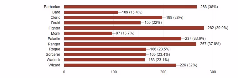In Age of Fantasy: Quest the popularity of the Fighter has finally evened out compared to the other martial classes, with the Barbarian getting the most significant jump in players with this survey. The Paladin also saw a small dip in players this time, though melee focused characters continue to be the most popular.