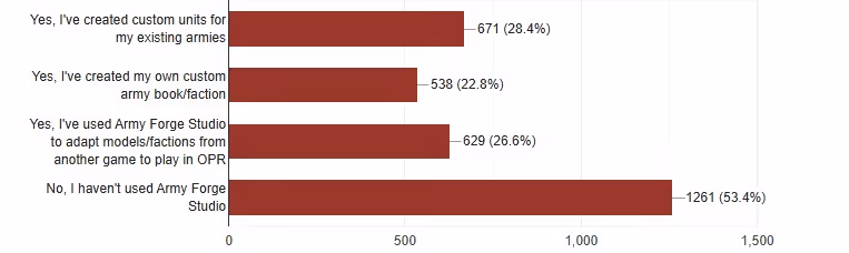 With Army Forge Studio, OPR lets you completely customize or even build up entire factions and armies for our games, and it seems nearly half of our audience uses it, though its a pretty even spread on exactly how they use it. We've already seen the fruits of their efforts because there are now hundreds of community created army books available for everyone to use in Army Forge. Thank you all for sharing your creations!