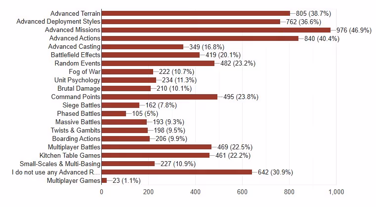 So which rules are you all choosing to use? The different missions are the most popular option, and probably the quickest way to add a ton of variety to your matches. And the second most popular option are the advanced actions that expand your tactical turn by turn choices. Though it isn't much of a surprise that Phased Battles is the least popular of the Advanced Rules given the popularity of OPR's Alternating Activations.