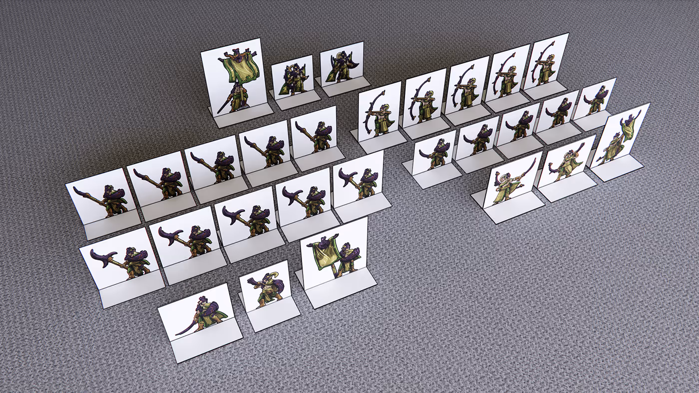 These sets feature a ton of minis with front and back views in two different color schemes, as well as black & white. They also include black border versions of the minis, plus VTT tokens to play online.