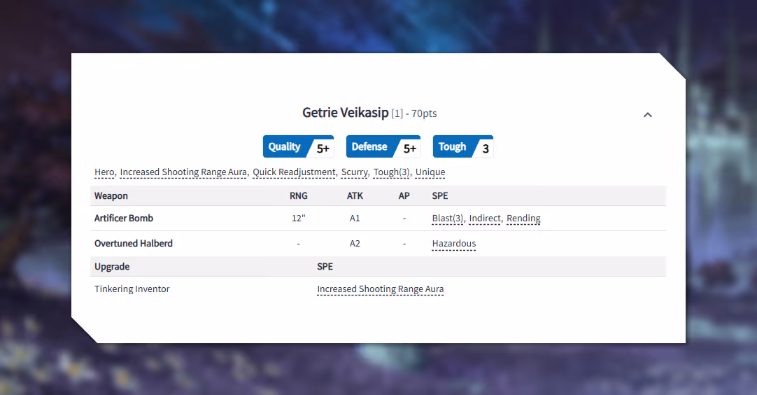 On the table, Getrie is a boon to any ranged focused squad! Her Increased Shooting Range Aura helps increase the threat of her unit, and with Quick Readjustment and Scurry, she can stay very responsive and mobile on the battlefield. Her bombs a great against soft infantry targets, even when they're entrenched in cover, and for more heavily armored foes, her Overtuned Halberd is an effective, if dangerous, option!
