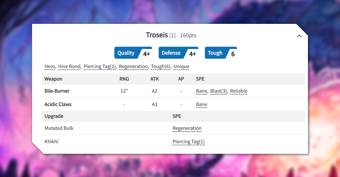 As the primary object of Troseis's focus, The Bile-Burner is the main way he likes to commit in battle. With 2 Attacks and Blast (3) he can douse a lot of infantry in acidic bile. Reliable makes sure that those initial hits actually hit to spread out the blast, and Bane makes sure that Regeneration wont be an issue and any lucky 6's turn into an enemies downfall instead. Khīkhī supports Troseis by adding Piercing Tag which will give some AP to any unit shooting at the tagged targets. Together they can take down even well defended units with a combination of AP and Rerolls.