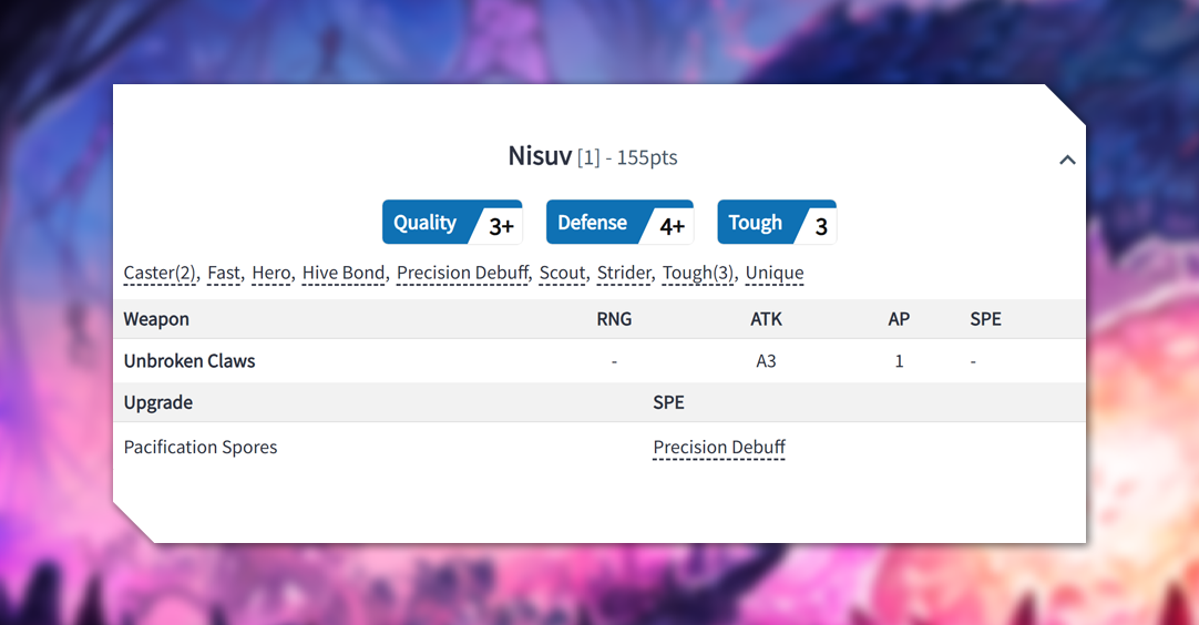 Nisuv is both smart and nimble in combat. With a combination of Fast, Scout, and Strider, he can get to where he needs to be rather efficiently. His positioning will be important for his Psychic abilities, represented by Caster (2). He'll want to be in range to make sure the right units get the right Buff or Debuffing Spells and Attack Spells are getting targeted exactly where they need to. On top of that his Pacification Spores are an additional Precision Debuff he can use to force an enemy unit to get -1 on their next attack roll, protecting more vulnerable hivers from weapons fire or melee assaults.
