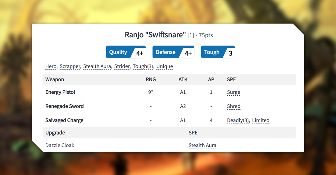 As a Veteran Scrapper and survivor Ranjo always has at lot of tricks and gadgets to help him in combat. His Energy Pistol allows him to get off a shot when needed and a lucky 6 will get it to hit twice with Surge. The Renegade Sword takes the complete opposite approach to taking care of the Jackal's enemies by Shreding them, meaning any 1's to save gives them extra wounds. One of his tricks is a single Limited Salvaged Charge he keeps with him just in case. If he sets if off and it hit's, with AP 4 and Deadly (3) it's going to take a sizeable chunk out of that target, potentially taking them out of the fight for good. Lastly his Dazzle Cloak gives him and unit Stealth as a way to defend themselves from enemy shooting, making them harder to hit if they're far enough away.
