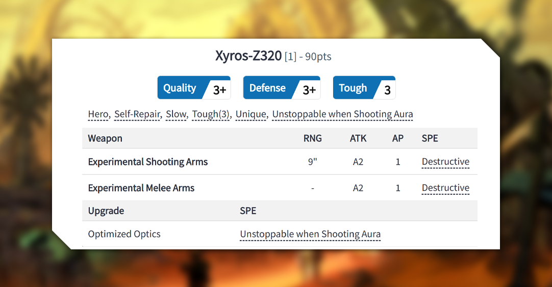 Xyros-Z320 is calculated in combat, even more so than other Robots. Unstoppable when Shooting that he gives himself and his unit through his Optimized Optics means that anything fired is going to hit on exactly what you expect it to hit on. In Xyros' case a 3+ from his Quality means his Experimental Shooting Arms will be hitting more often than not, and if they hit on 6's the enemy can say goodbye to their armor as those shots will get AP4 from Destructive. His Experimental Melee Arms are just as Destructive so getting up close to him doesn't take away that threat at all.